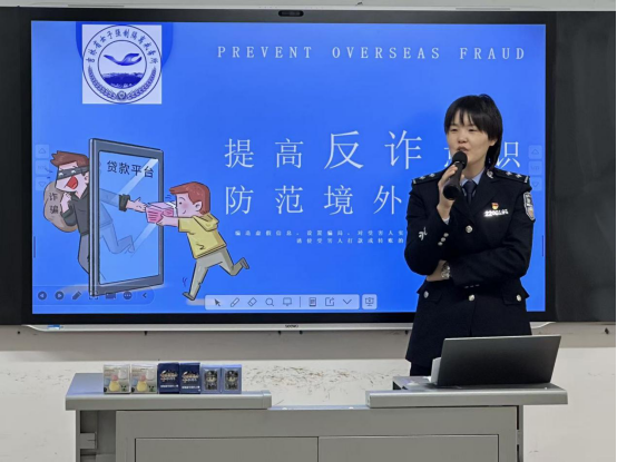首先,田远警长对如何预防电信网络诈骗进行了专题讲解。她结合当前高发的诈骗案例,生动剖析了刷单返利、虚假购物、冒充客服等常见诈骗手法,详细讲解了识别和防范技巧,叮嘱同学们时刻保持警惕,不轻信、不转账、不透露个人信息,牢牢守住自己的“钱袋子”切实维护自身财产安全。